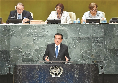 2016年9月21日,李克强同志在纽约联合国总部出席第71届联合国大会以“可持续发展目标:共同努力改造我们的世界”为主题的一般性辩论并发表题为《携手建设和平稳定可持续发展的世界》的讲话。 新华社记者 李涛 摄