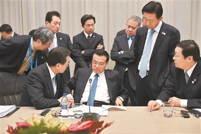 2014年12月16日,李克强同志在贝尔格莱德出席第三次中国-中东欧国家领导人会晤。这是会谈间隙,他与随行部长进行会商。 新华社发