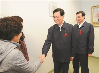 2008年12月1日是第21个世界艾滋病日。胡锦涛同志和李克强同志来到北京地坛医院考察艾滋病防治工作。新华社记者 马占成 摄