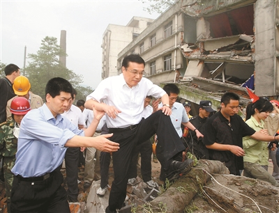 2008年5月19日,李克强同志在四川地震灾区察看灾情。 新华社记者 兰红光 摄