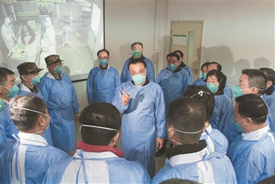 2020年1月27日,李克强同志赴湖北省武汉市考察指导疫情防控工作,代表党中央、国务院慰问疫情防控一线的医务人员。 新华社记者 李涛 摄