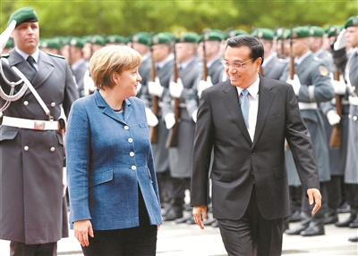 2013年5月26日,李克强同志在柏林出席德国总理默克尔举行的欢迎仪式。 新华社记者 马占成 摄