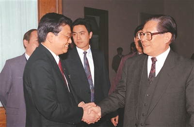 1993年5月3日下午,中国共产主义青年团第十三次全国代表大会在北京人民大会堂开幕。在5月3日上午的预备会议后,举行第一次主席团会议,推选李克强等同志为主席团常务主席。这是江泽民同志与李克强同志握手。 新华社记者 郭占英 摄