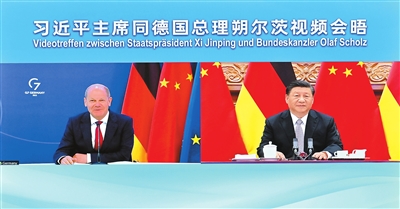 5月9日下午,国家主席习近平在北京同德国总理朔尔茨举行视频会晤。新华社记者 李学仁 摄