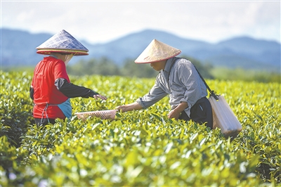 让“绿水青山”实实在在转化为“金山银山”。图为5月11日,海南省白沙黎族自治县茶农在忙着采摘茶叶。 (图片来源:视觉中国)
