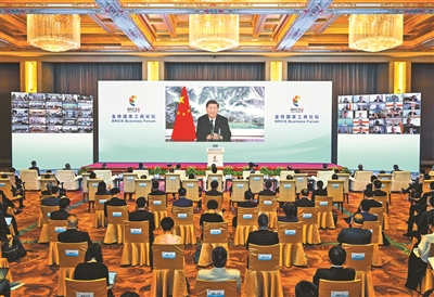 6月22日晚,国家主席习近平以视频方式出席金砖国家工商论坛开幕式并发表题为《把握时代潮流 缔造光明未来》的主旨演讲。新华社记者 殷博古 摄