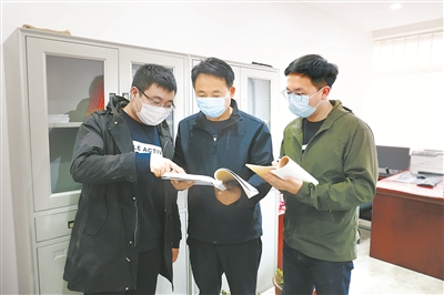 辽宁省盘锦市纪委监委第七纪检监察室四级主任科员马宝华(中)和同事讨论分析案情。 徐腾 摄