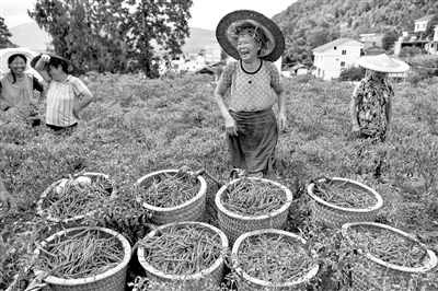 贵州省思南县塘头镇青杠坝村位于武陵山深处,过去因为交通闭塞、自然条件恶劣,村民农闲时节只能靠编草鞋等增加收入,是当地远近闻名的“草鞋村”。目前,青杠坝村农民人均年可支配收入达1.5万元,集体经济年收入突破600万元。如今,青杠坝已摘掉了“草鞋村”的穷帽子,成了民富村美的“小康村”。图为青杠坝村村民们采摘用作生产糟辣椒的红辣椒。 新华社记者 杨文斌 摄