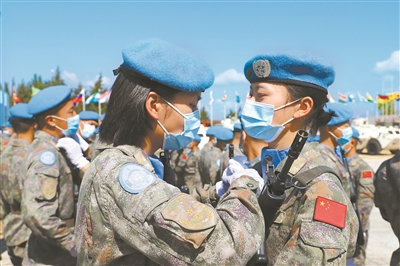 2021年6月16日,中国第19批赴黎巴嫩维和部队授勋仪式在黎巴嫩南部辛尼亚村的中国维和营举行,410名官兵全部被授予联合国和平勋章。图为授勋仪式上,接受检阅的维和女兵进场前互相整理着装。新华社发(刘雄马 摄)