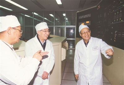 王大中是国际核能领域的著名学者、战略科学家,致力于发展具有固有安全特性的先进核能系统。他带领产学研联合团队实现了我国高温气冷堆技术从跟跑、并跑到领跑的整体发展过程,为我国在先进核能领域逐步走向世界前沿奠定了重要技术基础。图为王大中(中)在清华大学10兆瓦高温气冷堆临界现场。(清华大学供图)