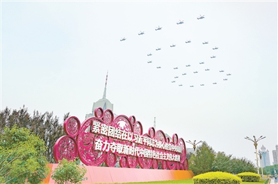 图为2021年7月1日,庆祝中国共产党成立100周年大会在北京天安门广场隆重举行,飞行编队飞过北京上空。(图片来源:人民视觉)