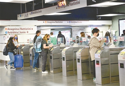 针对疫情形势,意大利将室内强制口罩令延长至6月15日,民众进入医院、疗养院等场所以及乘坐公共交通工具时仍需佩戴口罩。图为近日,罗马市民在通过地铁站检票口。 新华社记者 金马梦妮 摄