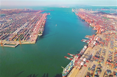 今年一季度,我国外贸进出口总值9.42万亿元人民币,同比增长10.7%,连续7个季度保持正增长。图为4月23日,青岛前湾港集装箱码头一派繁忙景象。 (图片来源:视觉中国)