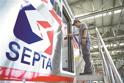 今年以来,天津中车唐车轨道车辆有限公司制造的4辆城际动车组已分两批发运北美地区,公司预计下半年还将发运约20辆城际动车组。图为7月14日,天津中车唐车轨道车辆有限公司工作人员在查看车体。新华社记者 李然 摄