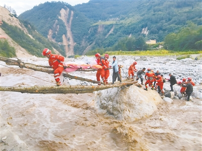 在磨西镇青冈坪村,四川省森林消防总队甘孜支队消防员在现场搭制的简易木桥上转移受伤村民,在急流上,用树干搭起“生命通道”。