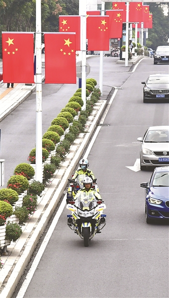 9月30日,在安徽省合肥市,交警蜀山大队铁骑中队在南一环开展路面巡查,守护市民假期平安出行。新华社发(陈三虎 摄)