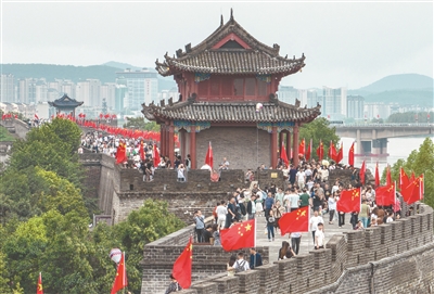 9月30日,湖北襄阳古城景区、街头挂上一面面五星红旗,喜庆气氛吸引不少游客前来游览拍照。图片来源:视觉中国