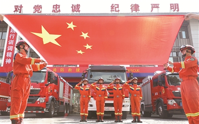 9月30日,在江苏省淮安市洪泽区消防救援大队,消防指战员向国旗敬礼。图片来源:视觉中国