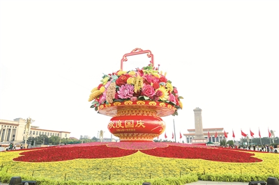 这是近日拍摄的北京天安门广场上的“祝福祖国”巨型花篮。 图片来源:视觉中国