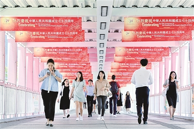 近日,香港特别行政区金钟一带的灯柱、围栏及天桥等处,纷纷装饰上写有庆祝国庆的横幅及彩旗。图片来源:视觉中国
