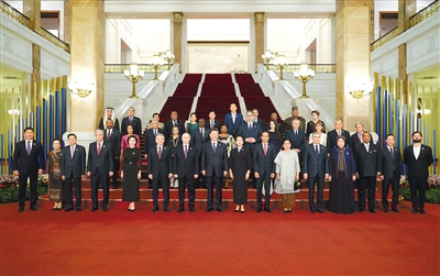 10月17日晚,国家主席习近平和夫人彭丽媛在北京人民大会堂举行宴会,欢迎来华出席第三届“一带一路”国际合作高峰论坛的国际贵宾。这是习近平和彭丽媛同国际贵宾合影留念。新华社记者 李学仁 摄