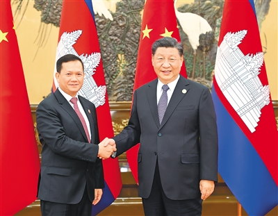 10月19日上午,国家主席习近平在北京人民大会堂会见来华出席第三届“一带一路”国际合作高峰论坛的柬埔寨首相洪玛奈。 新华社记者 黄敬文 摄