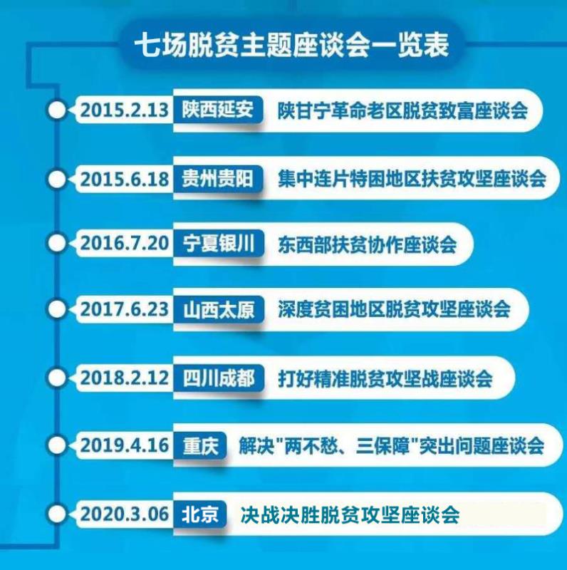 这是习近平总书记2015年来第七次针对扶贫工作召开座谈会。习近平总书记在七场座谈会上分别就革命老区脱贫致富、集中连片特困地区扶贫攻坚、东西部扶贫协作、深度贫困地区脱贫攻坚、打好精准脱贫攻坚战、解决“两不愁三保障”突出问题、决战决胜脱贫攻坚等发表重要讲话。这一系列讲话成为指导中国打赢脱贫攻坚战的重要思想、重要部署、重要保障。七次座谈会,七次不同重点,习近平总书记都谈了哪些内容?作出哪些部署?